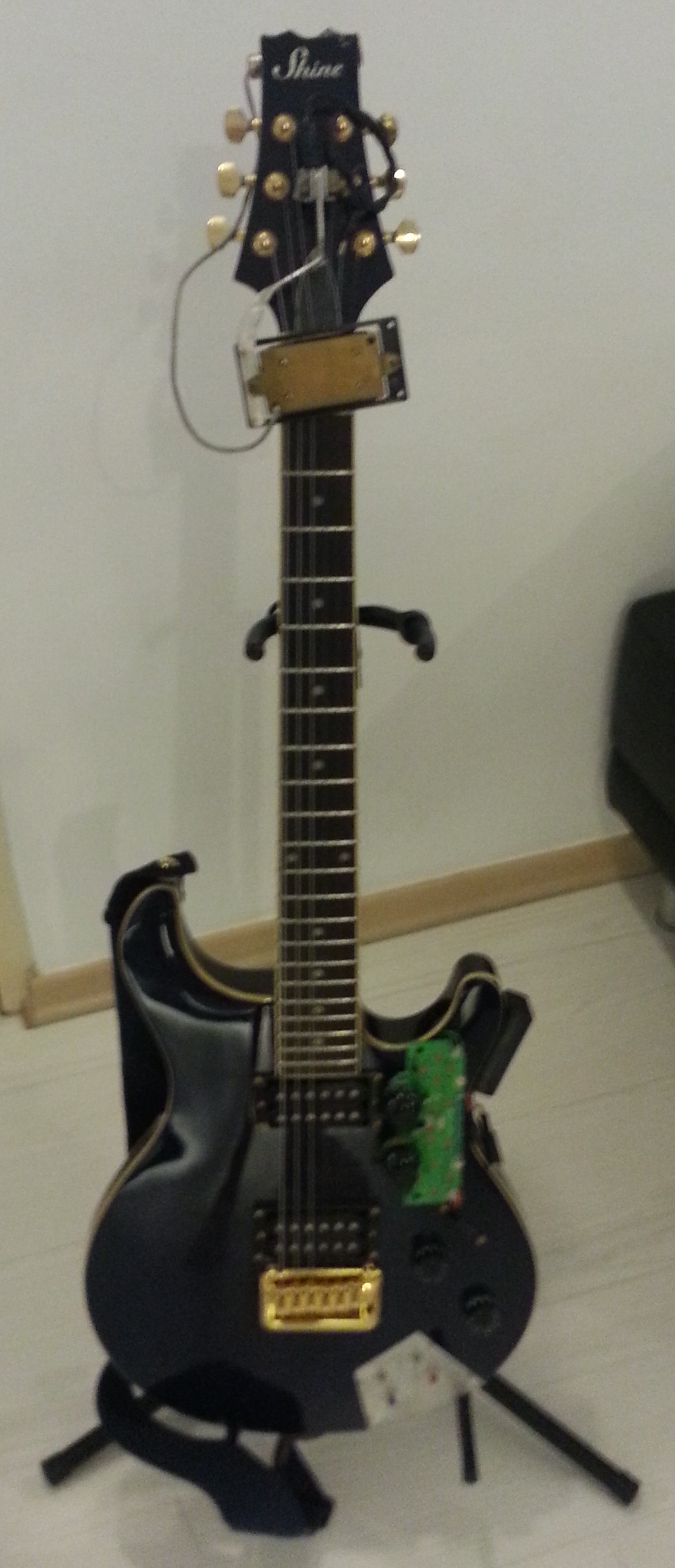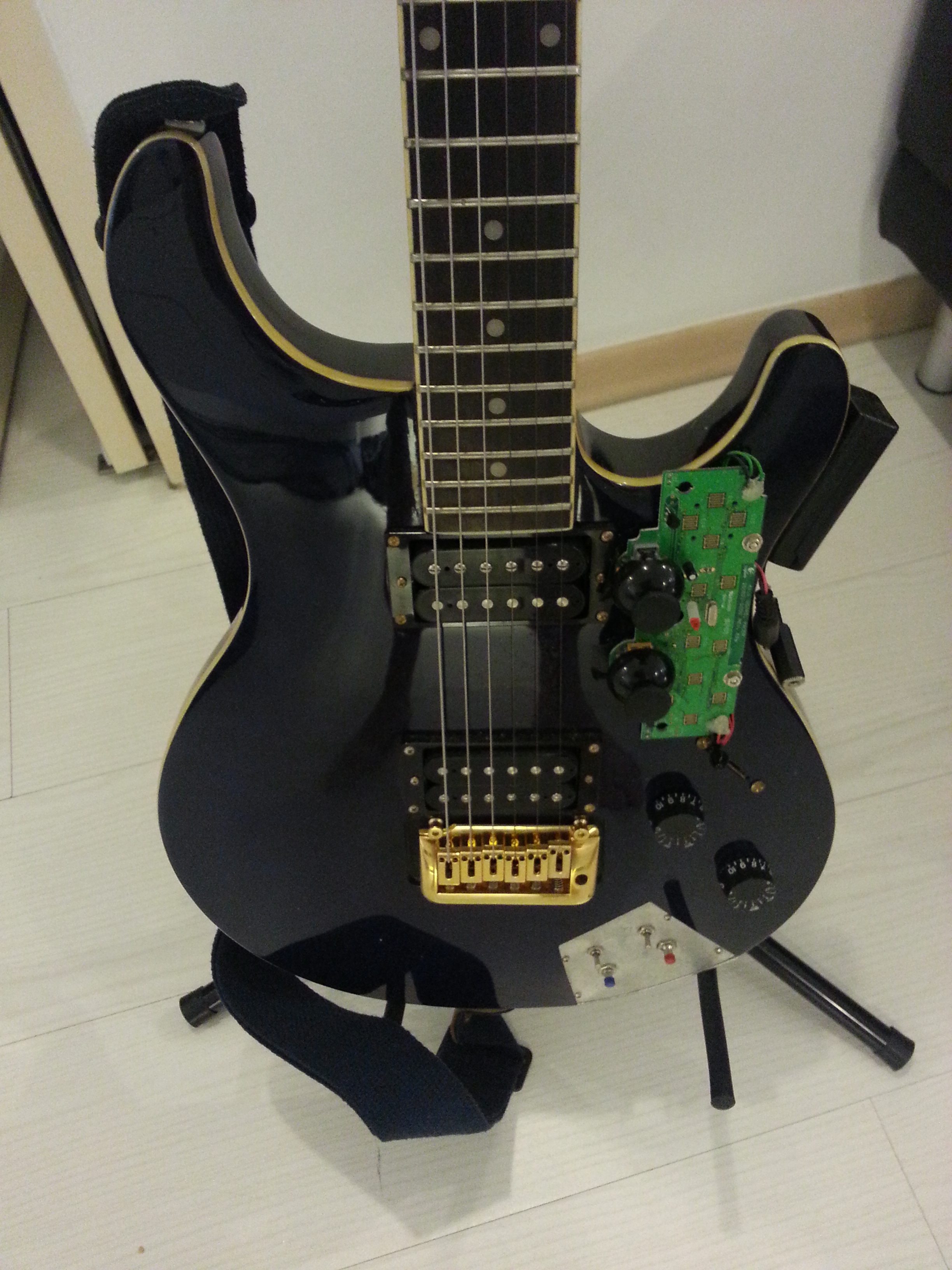 The hardware consists of a head-stock pickup, and a built in gamepad with 2 mini-joysticks, 2 switches and 2 buttons, as well as a small MIDI foot controllers. The software has a harmonizer (with an intelligent counterpoint improvisor that I wrote), waveshaping, and an FFT dynamically variable FFT filter.